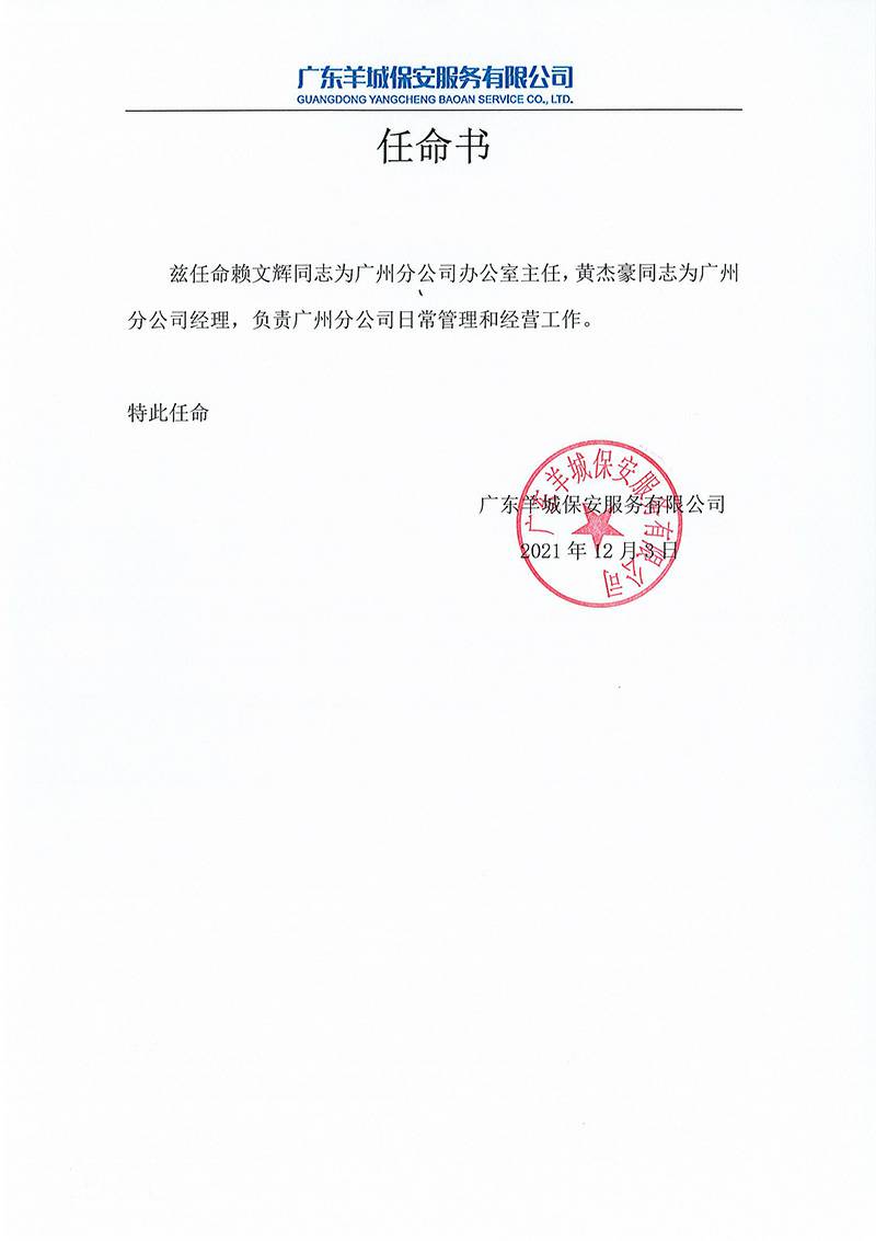吉林周凯物业租赁管理有限公司关于黄杰豪与赖文辉的任命书正式通知